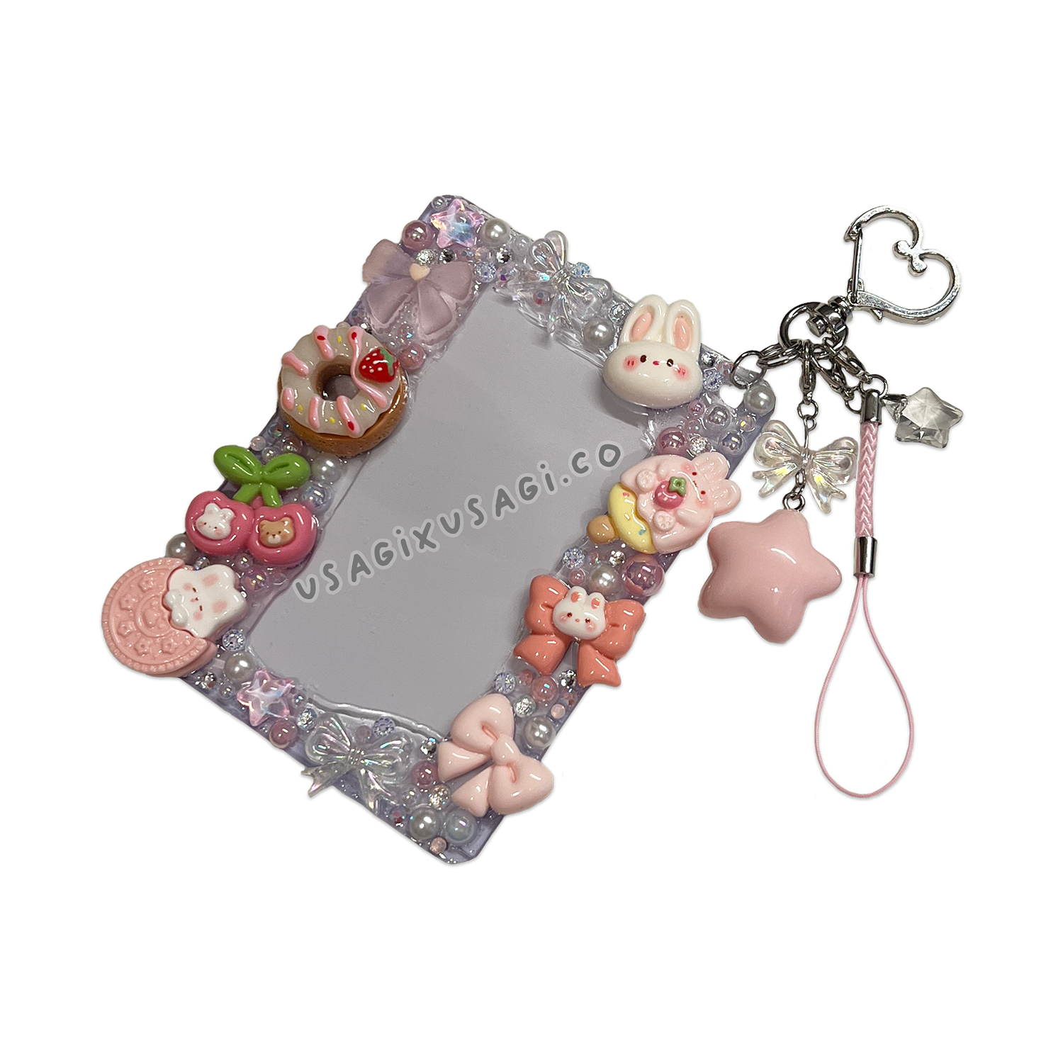 Treat your collection to something extra sweet with this bunny & dessert–themed decoden toploader! 🐇💕 Featuring a cute bunny charm surrounded by tiny dessert accents like cakes, donuts, and pastel treats, this design is perfect for showing off your favorite photocards, polaroids, or mini prints in the cutest way possible.