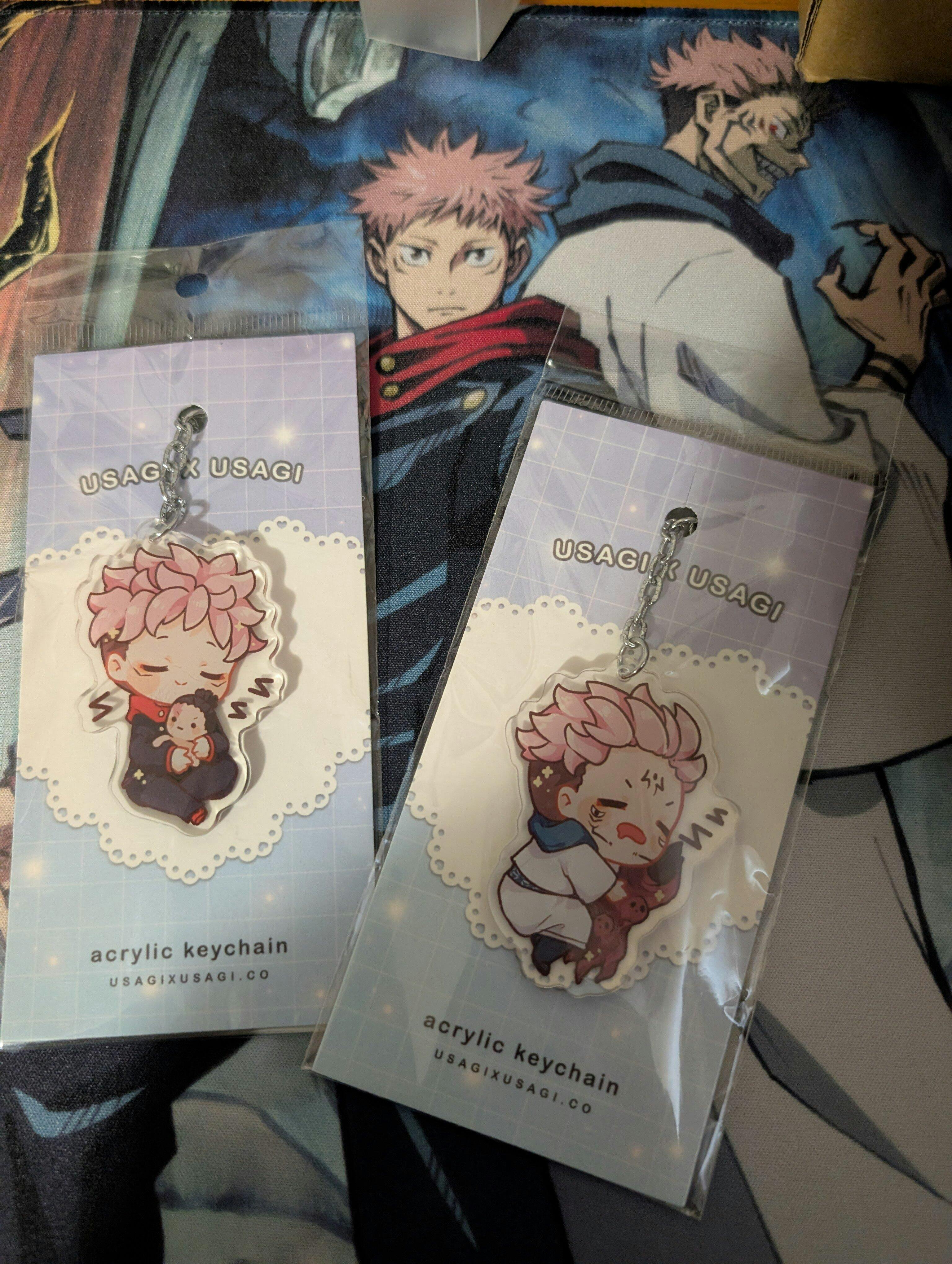 They made the journey to Australia in one piece. Absolutely love them. Double sided acrylic so even if they get scratched the paint won't chip. I got Sukuna and Yuji and I adore them both. The print came out vibrant and perfect. Tempted to make a new work lanyard but I'll have to find a lanyard that is just as cute~ (wink wink, hint hint)