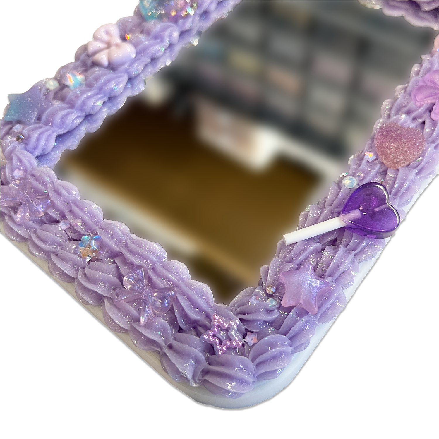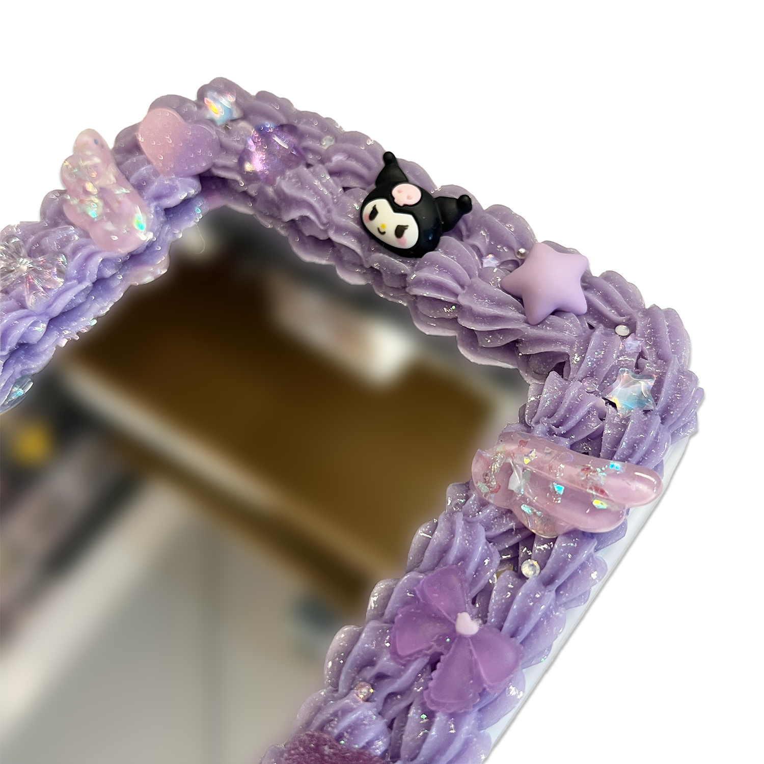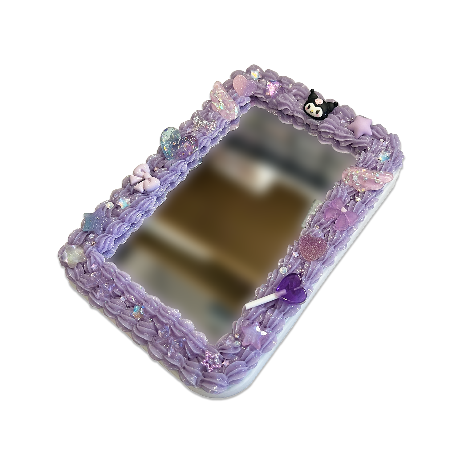 Add a touch of playful charm and a hint of mystery to your vanity with this handmade stationary one-sided face mirror, inspired by dark mischief vibes! Featuring a crisp white base decorated with purple accents and a unique decoden design, this mirror blends cute and edgy elements—perfect for those who love a little twist on kawaii style without trademark worries.