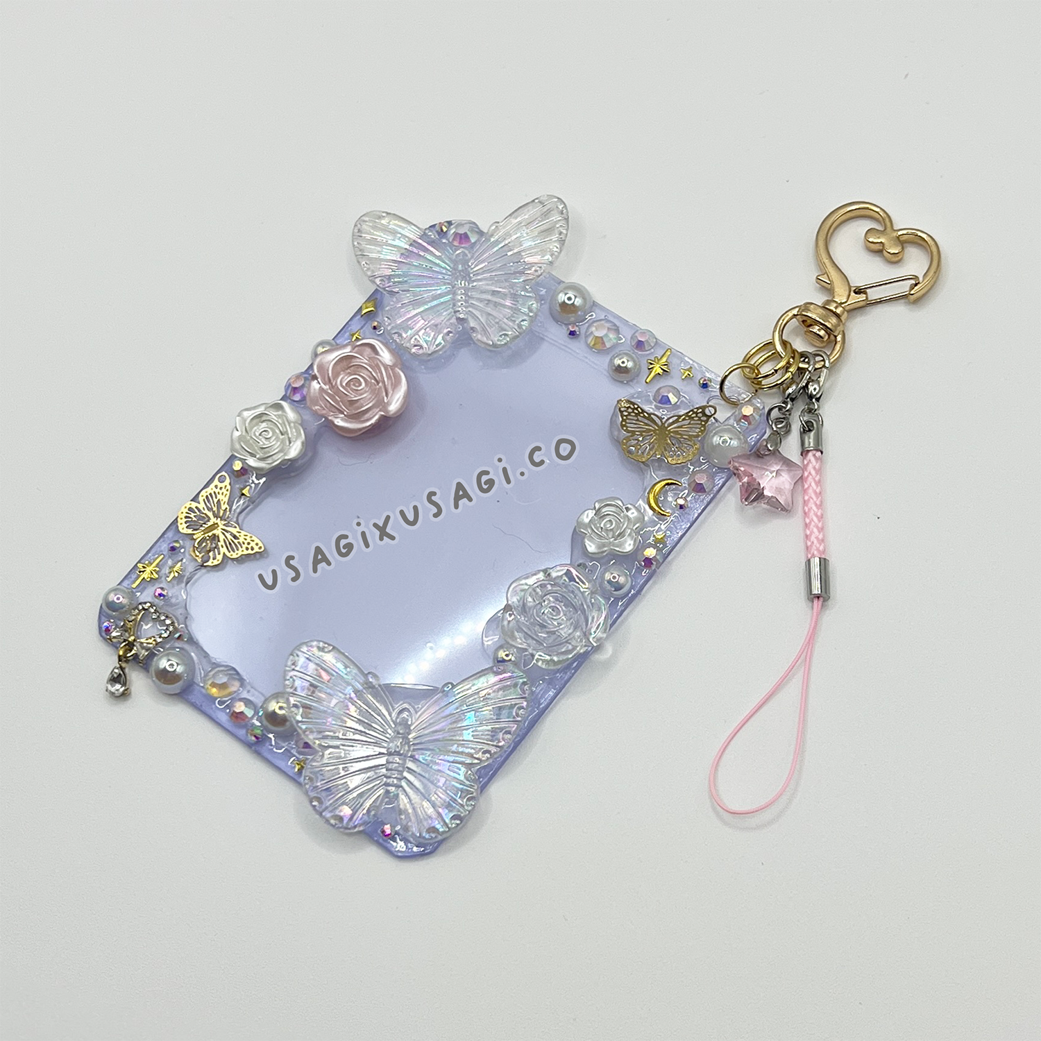 Soft, romantic, and sprinkled with fairy magic — this handmade decoden toploader features a dreamy pink and white garden theme, adorned with delicate roses, pearly cabochons, and shimmering gold butterflies that catch the light beautifully.