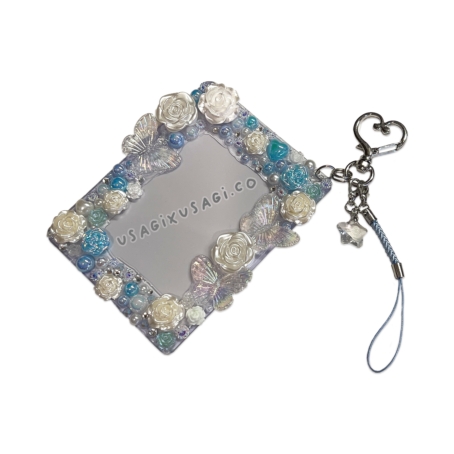 - 🦋 Features pastel blue roses, butterflies, pearly embellishments & floral details