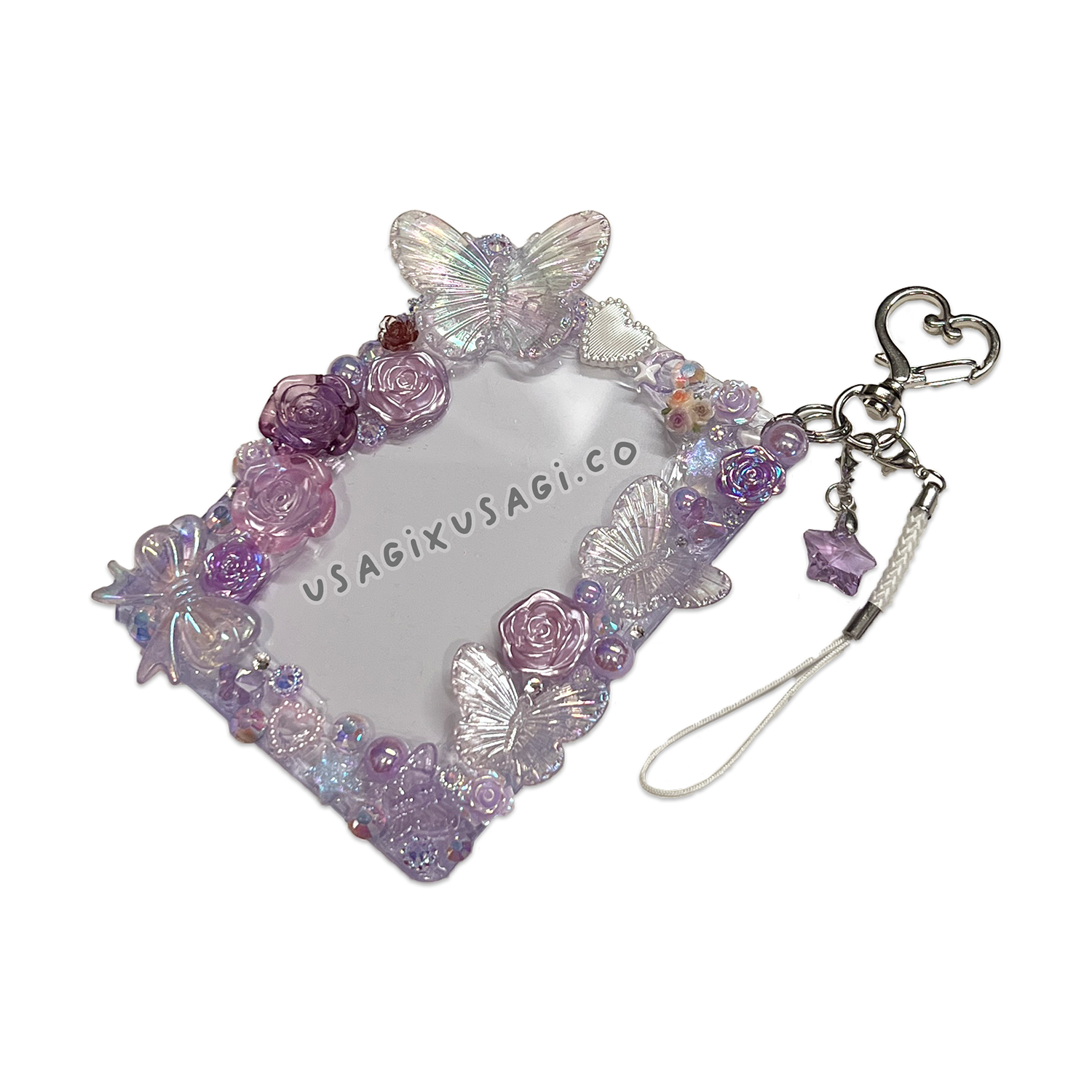 - 🦋 Decorated with purple butterflies, lavender roses & pearly cabochons