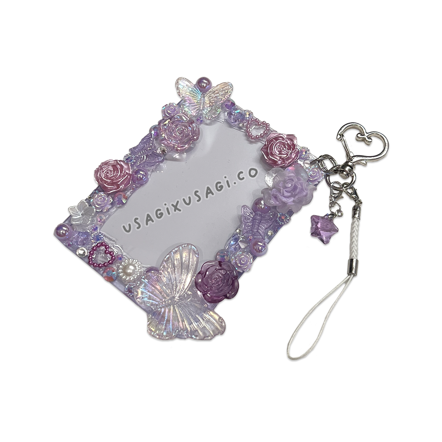 - 🤍 Decorated with purple & white butterflies, roses, and pearly cabochons