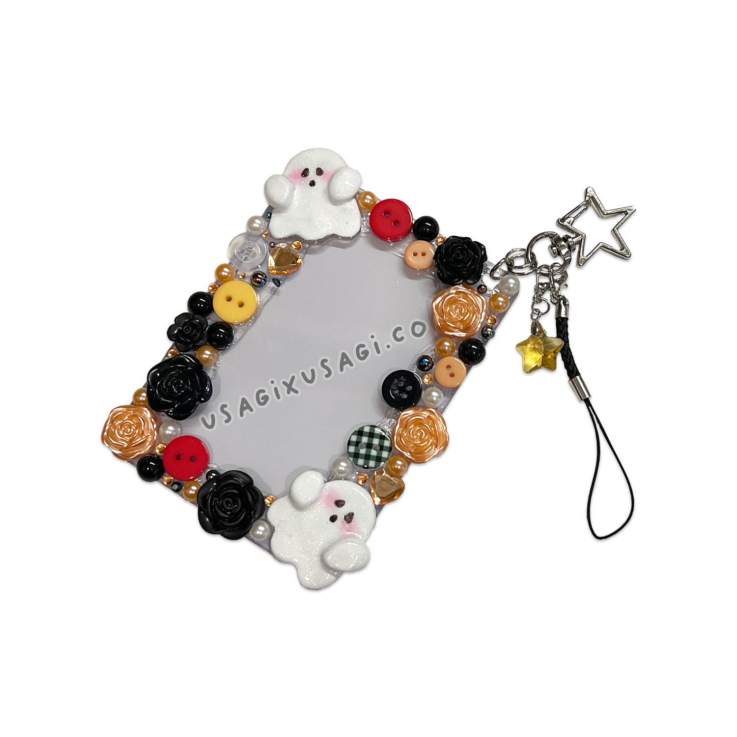 - 🧡 Decorated with cute ghost charms, orange & black cabochons, and button accents
