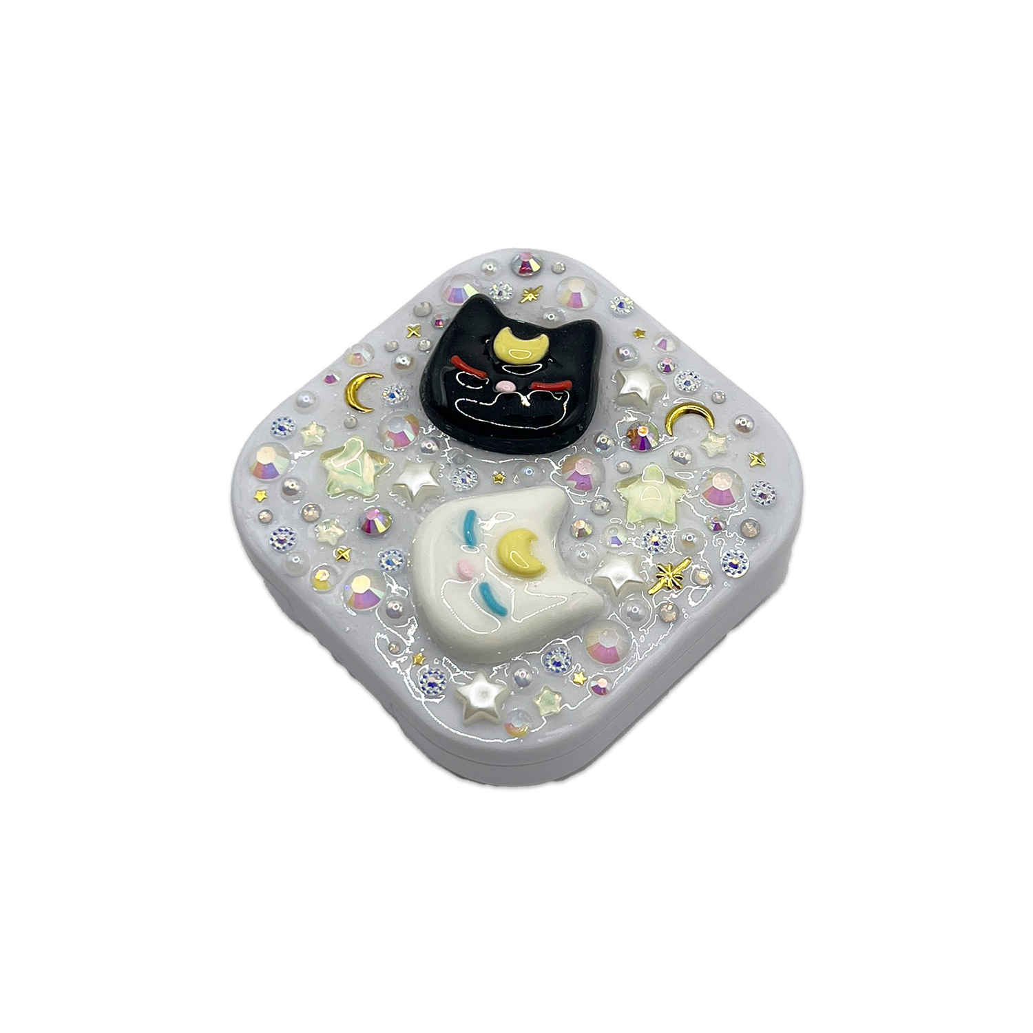 Soft, celestial, and full of magical-girl charm — this handmade decoden square compact mirror is inspired by an iconic moonlit cat duo. Decorated with pastel cabochons, pearly accents, and starry details, this compact brings pure moon-guardian energy to your everyday routine.