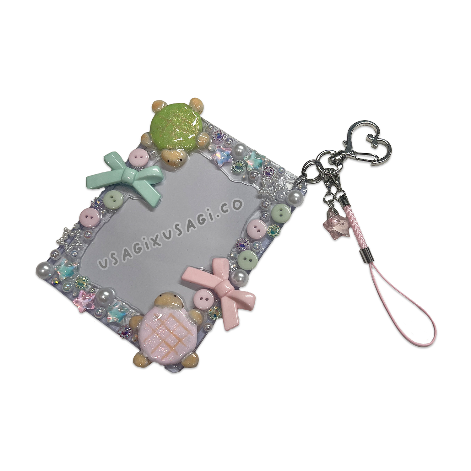 This handmade decoden toploader features an adorable turtle-shaped melon pan charm in pastel pink and green, decorated with pearly cabochons and soft glossy accents for the perfect café-style aesthetic. 🍞🌸