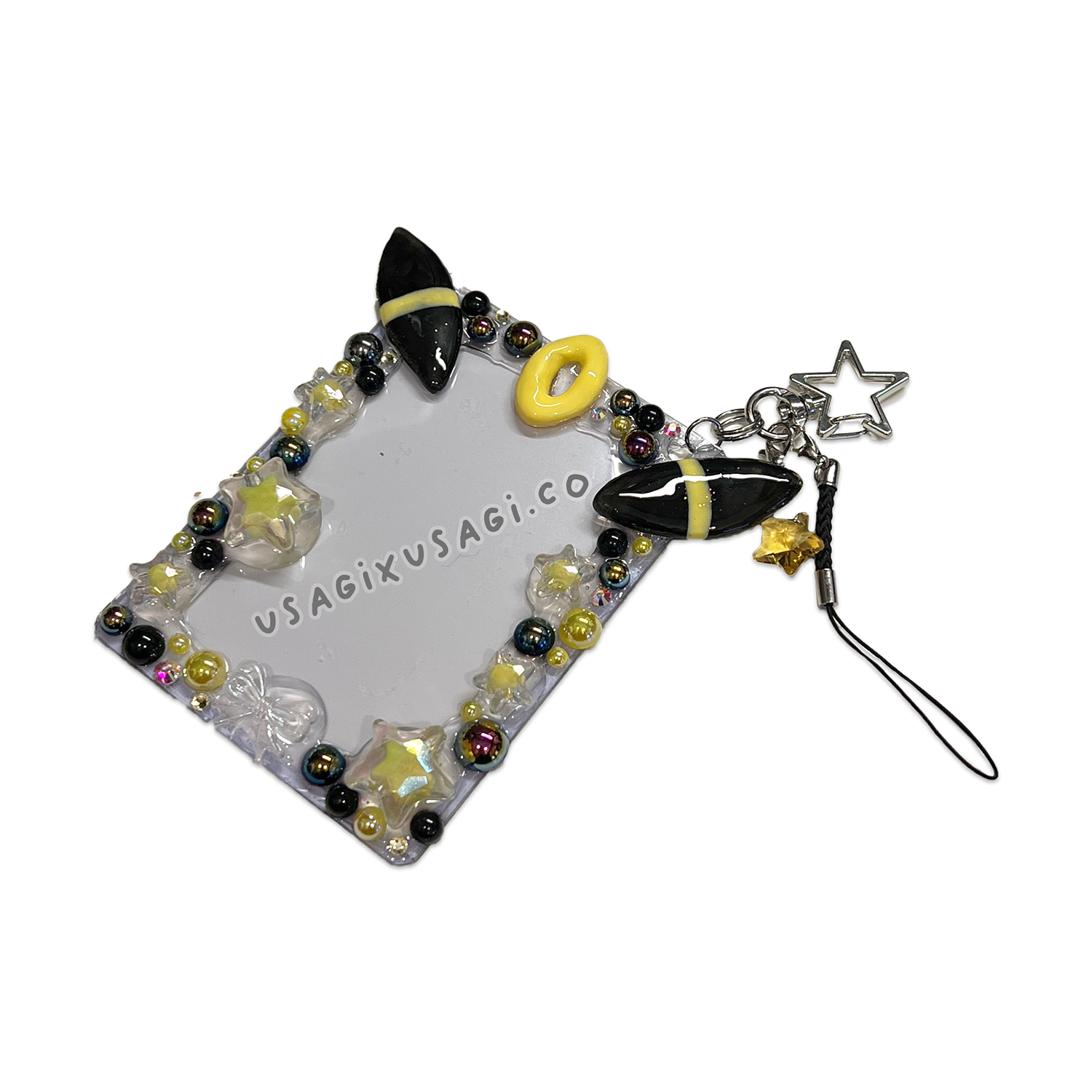 Mysterious, elegant, and glowing like the night sky — this handmade decoden toploader is inspired by a sleek midnight creature known for its moonlit charm. Decorated with yellow star accents, glossy black cabochons, and subtle celestial shimmer, this frame gives your photocard a bold and magical presence. 🌌✨