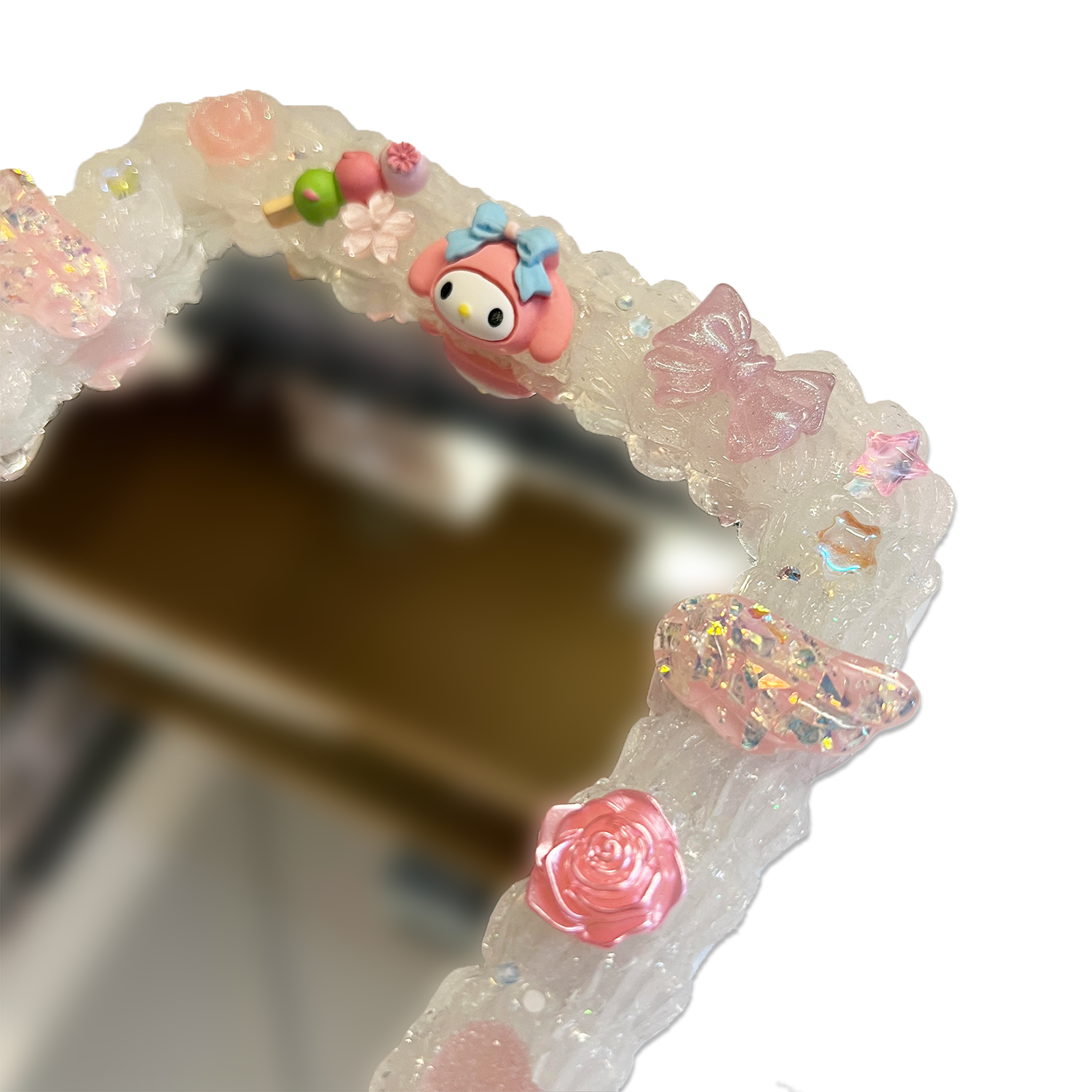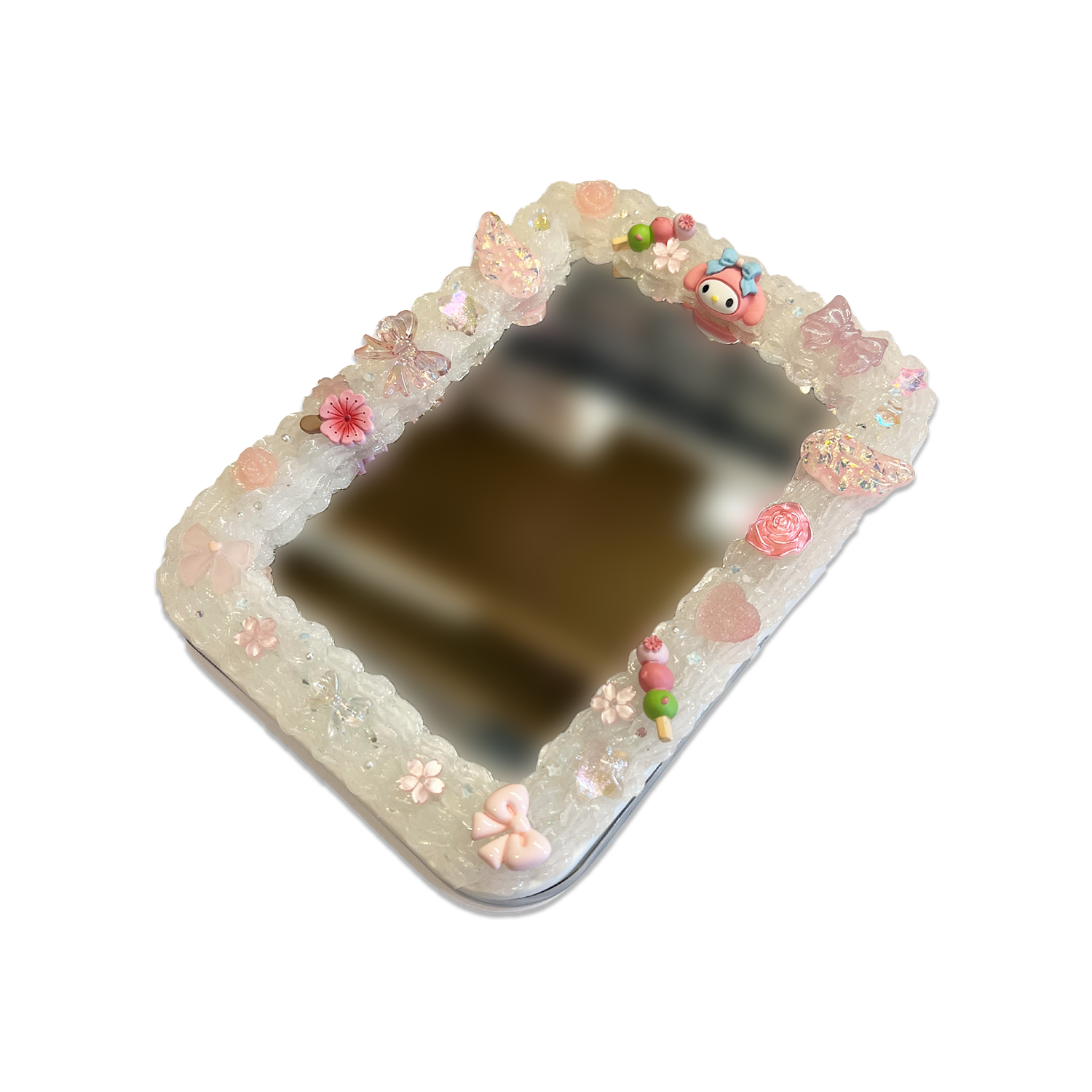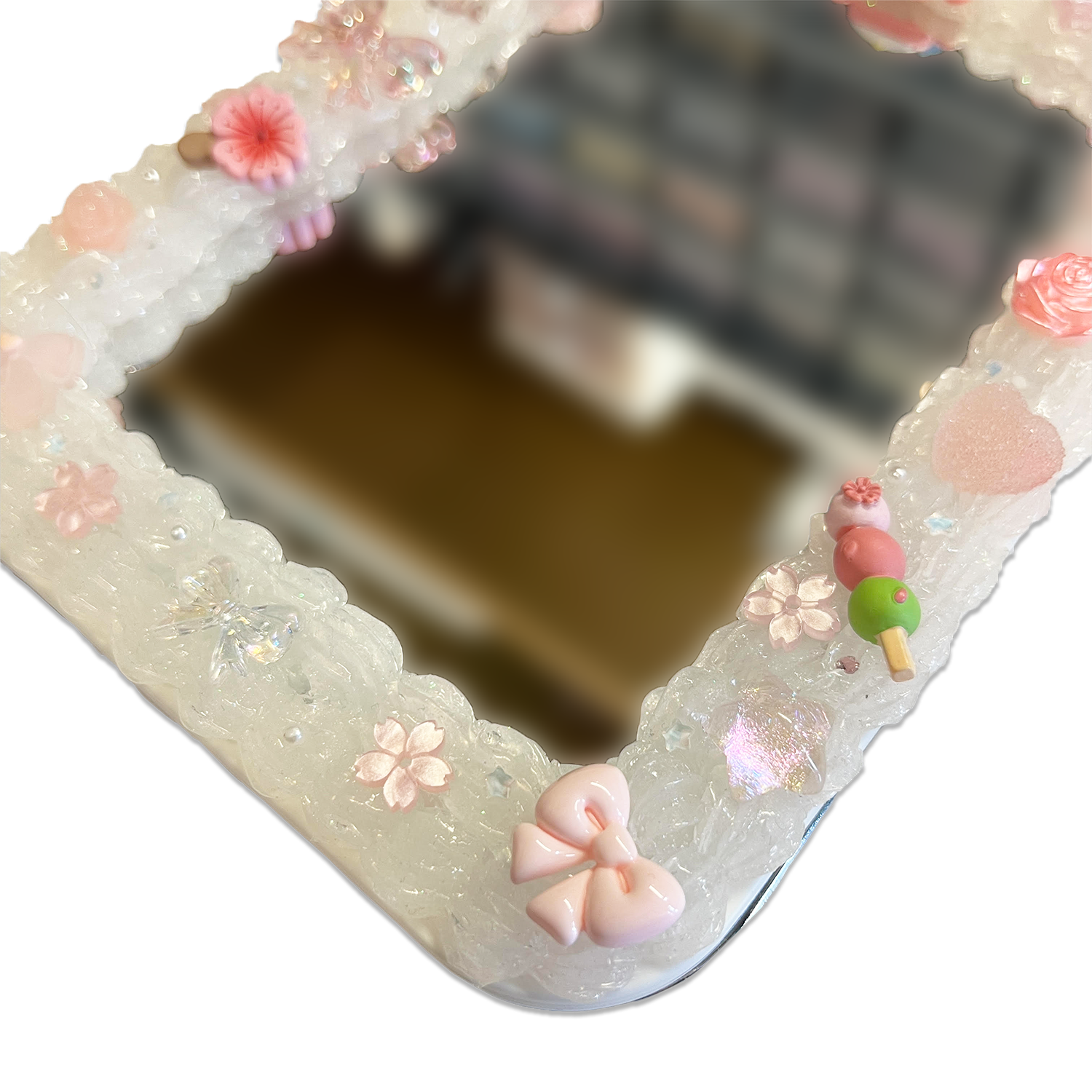 Bring a touch of gentle sweetness to your vanity with this handmade stationary one-sided face mirror, inspired by delicate floral and bow motifs! Featuring a pristine white base adorned with soft pastel decorations in a charming decoden style, this mirror adds a lovely kawaii vibe to your daily beauty routine—without any trademark concerns.