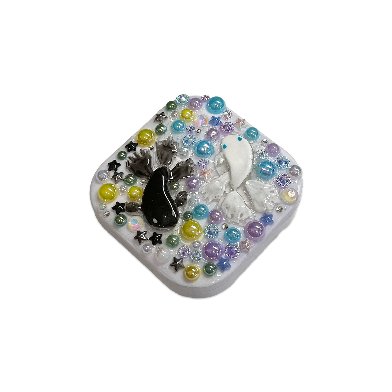 Graceful and symbolic, this handmade square compact combines mirror functionality with a dreamy 4-compartment storage inside—perfect for small items like jewelry, charms, or pills. 🌸✨ Inspired by the Satosugu duo, it features flowing betta fish charms in shimmering blue and black, accented with pearly details and glossy decoden artistry.