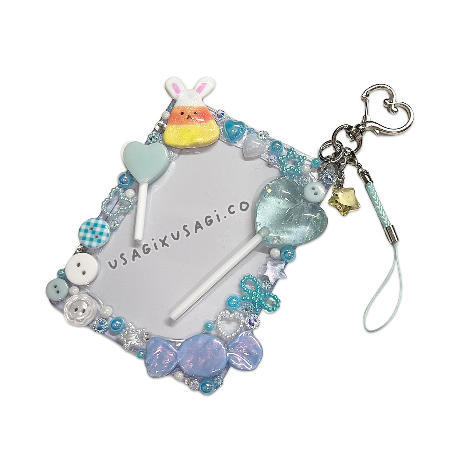 Sweet, whimsical, and perfectly pastel — this handmade decoden toploader features an adorable blue bunny dressed like candy corn, surrounded by glossy cabochons and sugary sparkle. 🧁✨ The soft blue palette adds a unique twist on the classic candy corn aesthetic, making it cute instead of spooky.