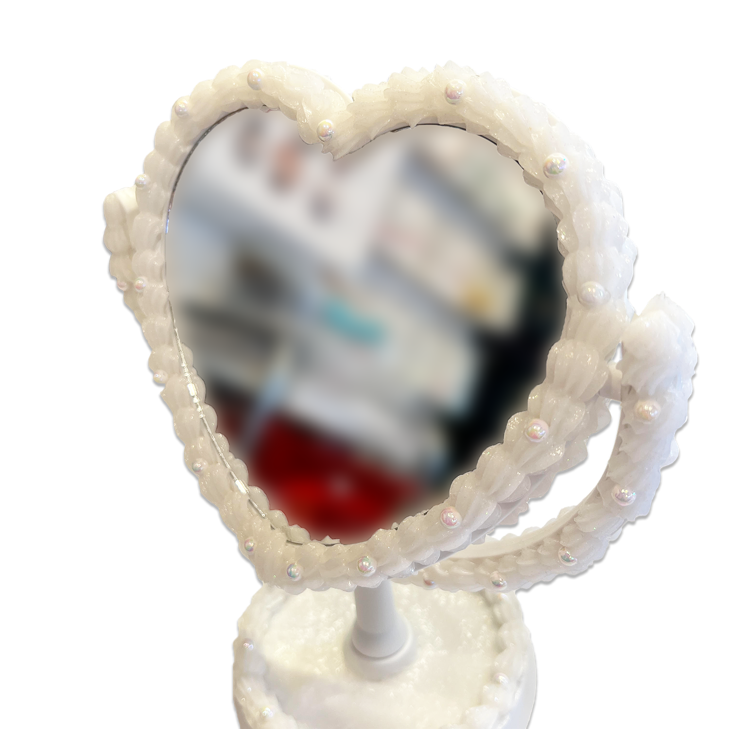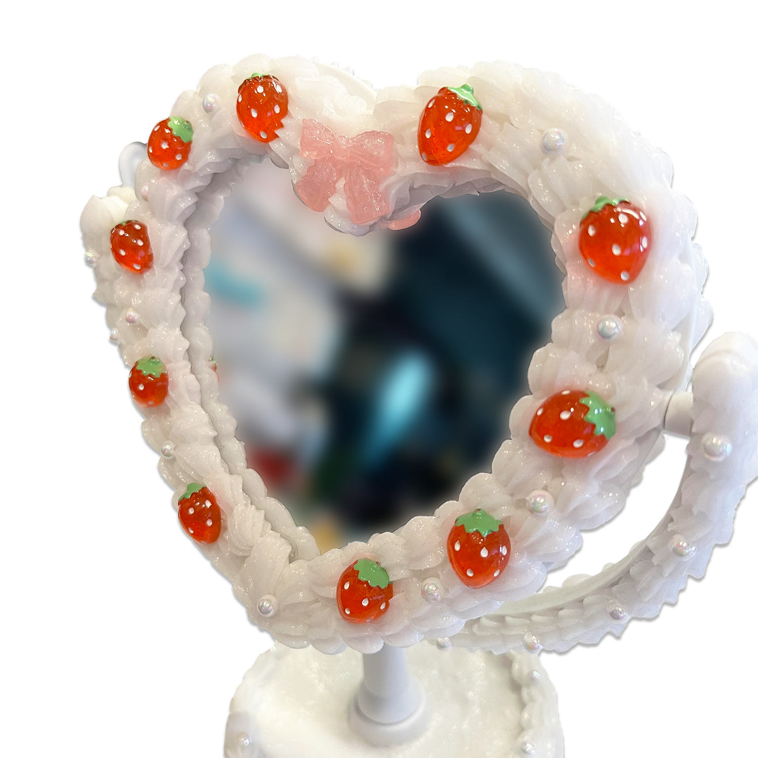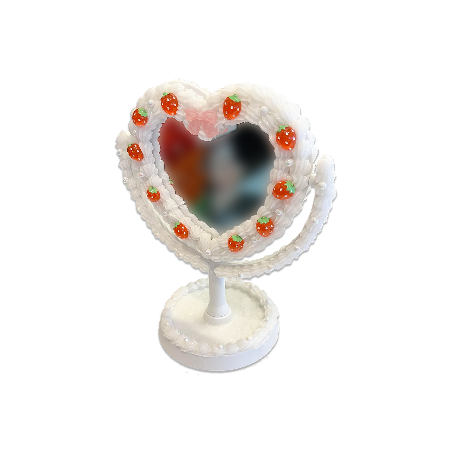 Add a touch of kawaii charm to your vanity with this handmade stationary double-sided heart mirror, beautifully decorated in a strawberry-cake inspired decoden style. Featuring a pristine white base adorned with adorable strawberry and cake-themed embellishments, this mirror is perfect for delicate touch-ups and adds a playful pop of sweetness to your desk or vanity space!