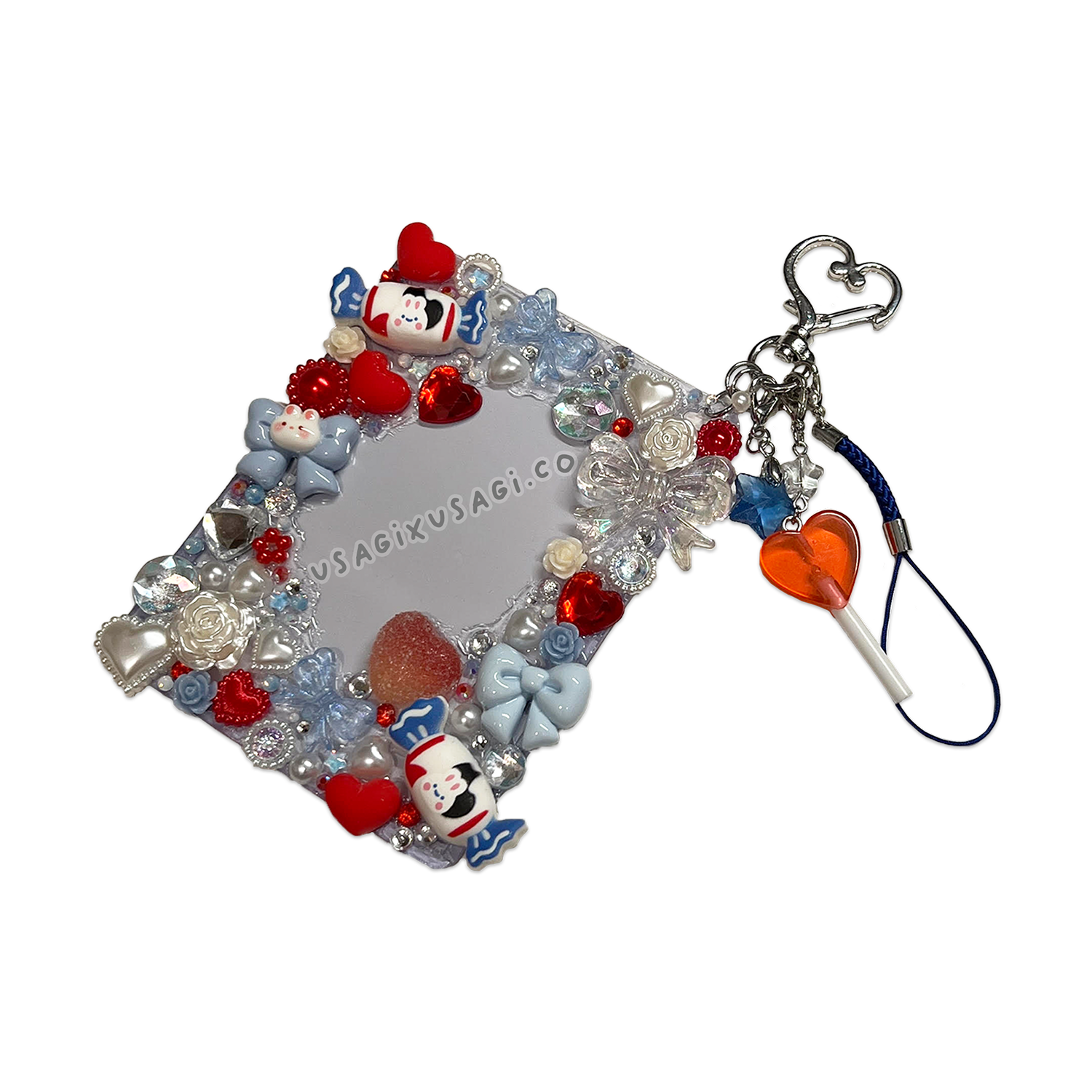 Fall down the kawaii rabbit hole with this white bunny candy-inspired decoden toploader! ✨🕰️ Featuring a bold red, blue, and white color palette, this piece is decked out with sparkly hearts, white rabbit candy motifs, cute bunny charms—perfect for any cutie chasing that magical, storybook-core aesthetic. 🃏🎀🍓